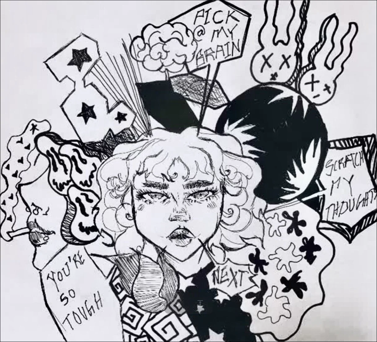 Pick My Brain (2023). Black and white illustration using maximalist work, line work and bold composition.
